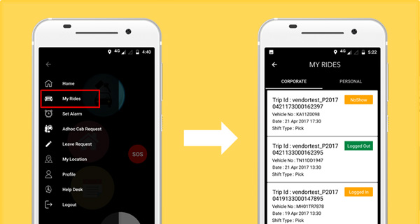 This Application developed with employee's convenience as a priority can be easily downloaded from PlayStore or iStore and installed on the phone. The employee can simply log in using their Employee Code and Password and avail multiple features to place Cab Request, Track trip, Send emergency messages, and many such enhanced features.